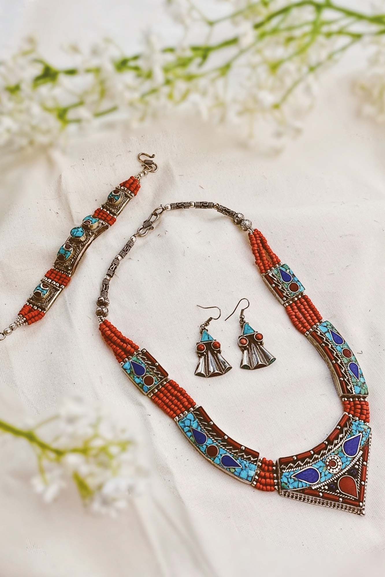 Het mooie van een sieraden set uit Tibet is dat ze de authentieke oude cultuur uit Nepal en Tibet weerspiegelen. Onze Tibetaanse sieraden komen niet uit Tibet, maar worden gemaakt door Tibetanen uit vluchtelingengemeenschappen in Noord-India of Nepal. Al 50 jaar zijn grote Tibetaanse gemeenschappen het door China geannexeerde Tibet ontvlucht om zich in India en Nepal te vestigen. Met jouw aankoop maak je vele mensen dankbaar want je steunt de lokale bevolking.