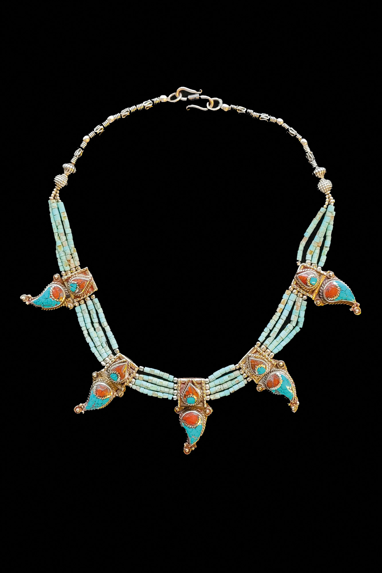 Prachtige, handgemaakte sieraden. Deze zijn met veel passie gemaakt in India door vluchtelingen uit Tibet & Nepal. Door deze sieraden te kopen draag je bij aan hun levensonderhoud. Elk sieraad is uniek en origineel, er is geen exacte kopie zo mag je er van uit gaan dat je echt iets bijzonders draagt. De zilveren sieraden zijn zorgvuldig ingelegd met echte Turkoois, Lapis Lazuli, bloedkoraal en zilver.