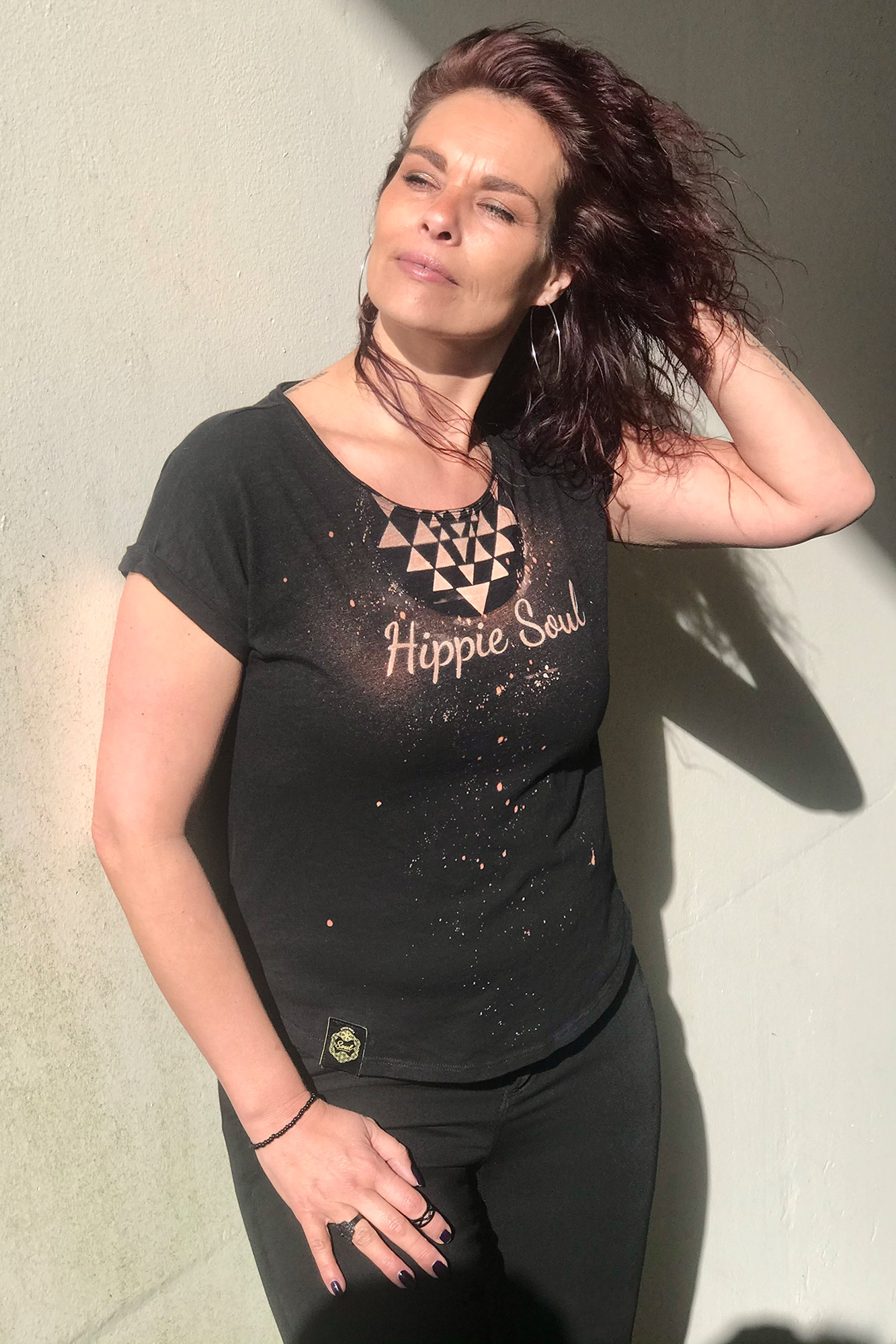 Het T-shirt Hippie Soul is echt iets voor jou. Met hart en ziel gemaakt in ons Soul atelier. Het halsje van dit shirt is gedeeltelijk voorzien van het Sri Yantra symbool wat een mooie blikvanger vormt. Een Sri yantra is een symbolische weergave van diverse aspecten van de godheid. Heerlijk, soepel vallend shirtje voor een aardige hippie dame met maatje M. Is van 100% katoen en het model kenmerkt zich door een langere achterzijde dan de voorzijde.