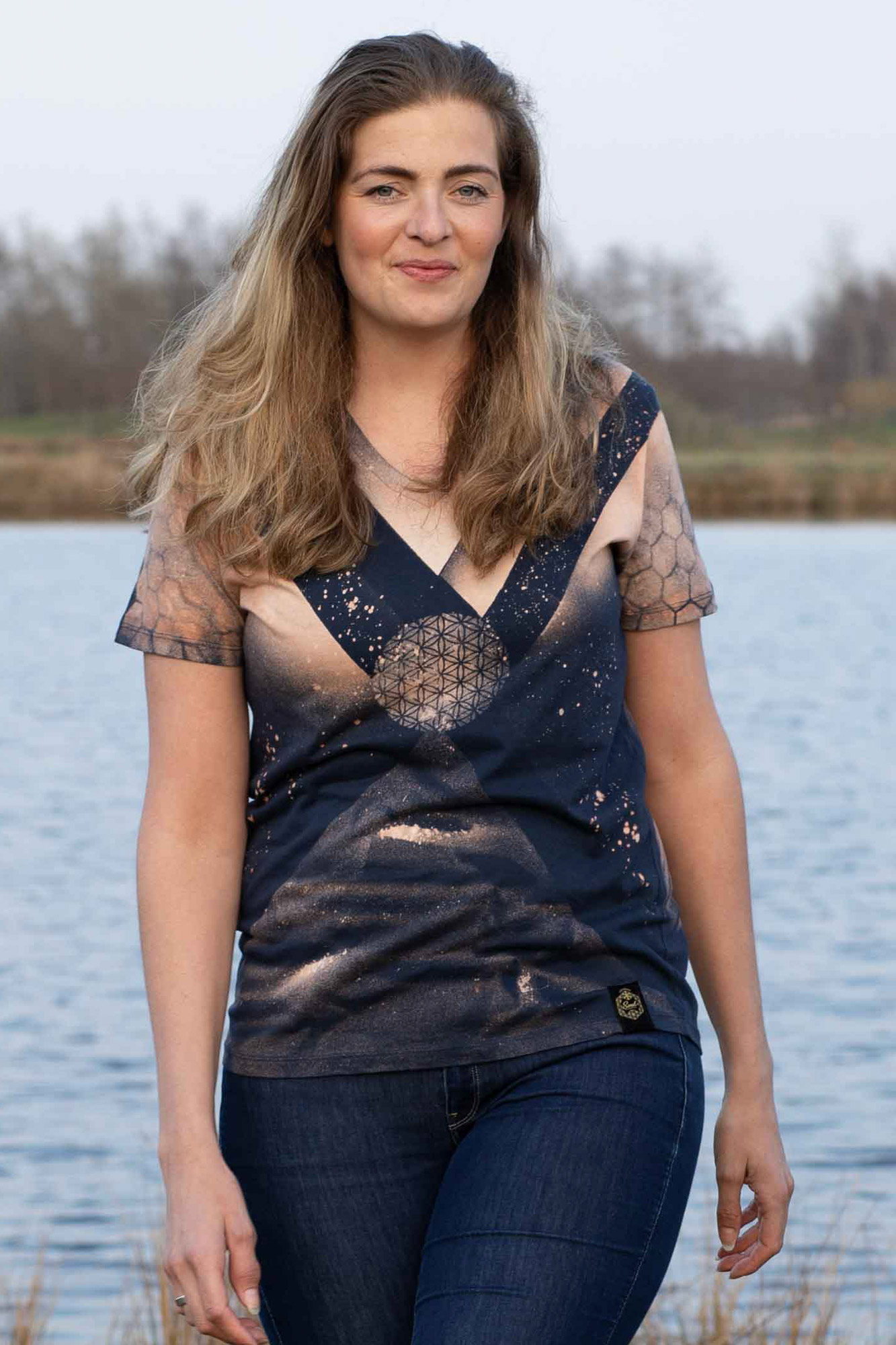Het is met veel passie, aandacht en bezieling gemaakt. Rechtstreeks gecreëerd vanuit de bron, de bron van creativiteit. De creativiteit stroomt vrijelijk in ons atelier.  Zonder al te veel na te denken en in een flow, zo is dit shirt ontstaan.