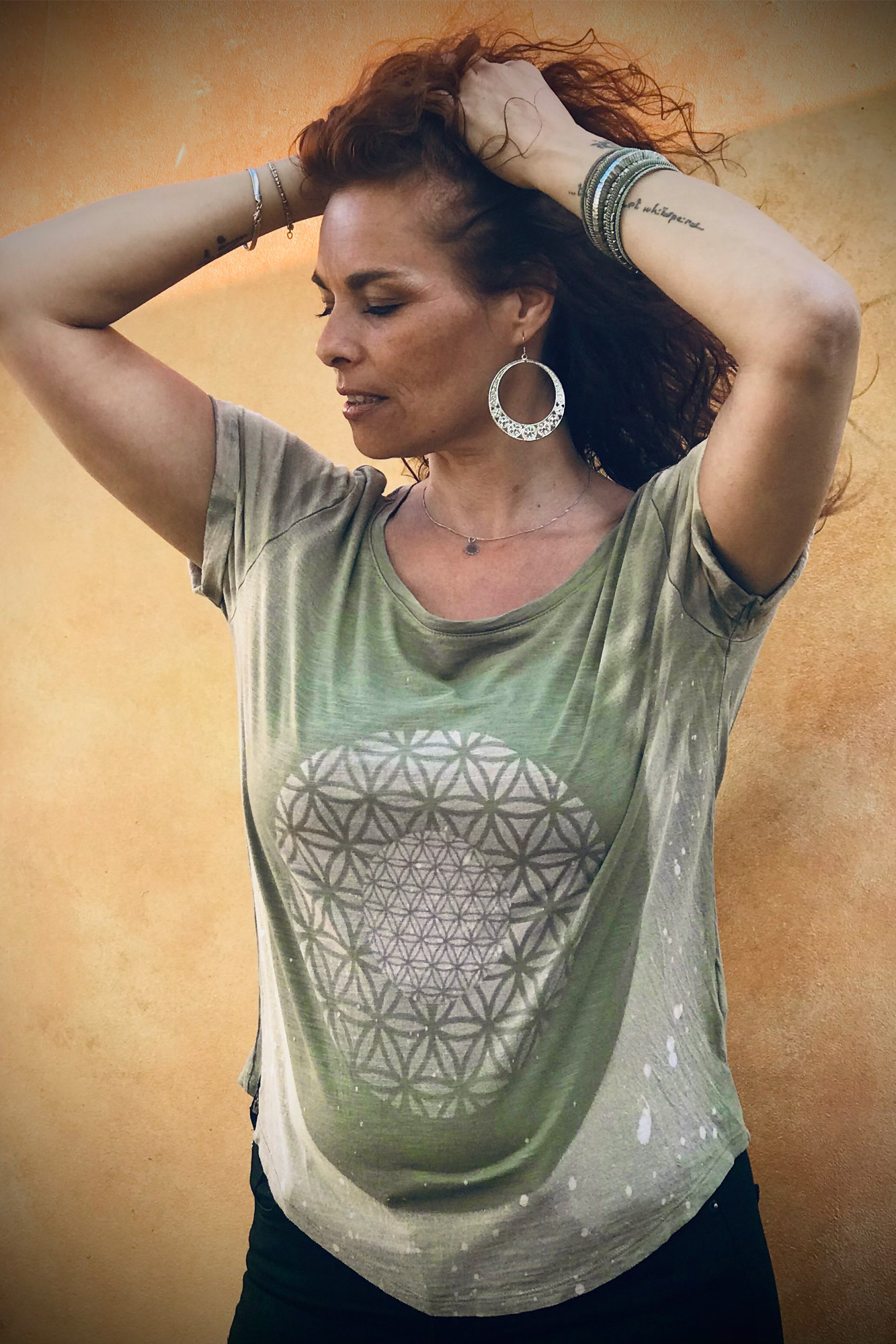Het T-Shirt Wild at Heart is een kunstwerk op zich en voorzien van The Flower of Life. Met behulp van verschillende Bleach Dye technieken is dit shirt van The Flower of Life met liefde en bezieling ontstaan. The Flower of Life belichaamt de cyclus van de schepping en laat zien dat al het leven voortkomt uit dezelfde bron. Draag dit Flower of Life T-shirt ‘Wilde at Heart als een herinnering aan de eenheid en harmonie in dit heilige geometrie symbool. “Wearable Art is what it is”. Gemaakt op extra dikke kwaliteit 100% katoen. Uiterst uniek, er bestaat er maar eentje van op de gehele wereld, is deze voor jou?